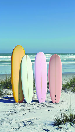 Two colorful surfboards are resting on the sandy beach, their vibrant designs contrasting with the natural hues of the coastline. The ocean waves gently crash nearby, inviting surfers to ride the waves.