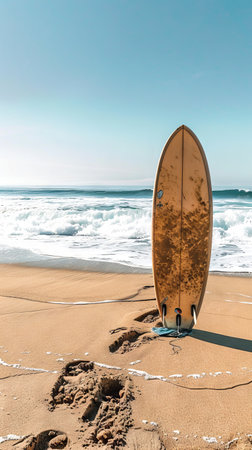 Surfboard standing in sand on a beach with ocean waves. Concept of surfing, water sports, beach lifestyle, summer activities. Vertical.
