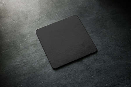 Blank black beer coaster mockup lying on grey desk. Square clear dark bar cork table-mat design mock up top side view. Quadrate cup or bottle rug display, isolated.