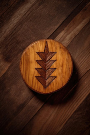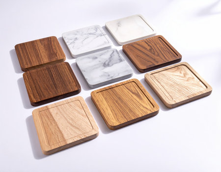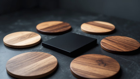 AI Generated. A collection of wooden coasters arranged around a central black square coaster on a dark surface
