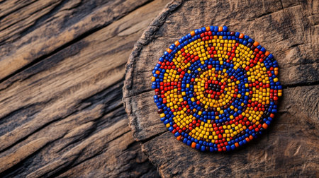 This image features a vibrant, round beaded design resting on a rustic wooden surface, highlighting exquisite craftsmanship and natural beauty.