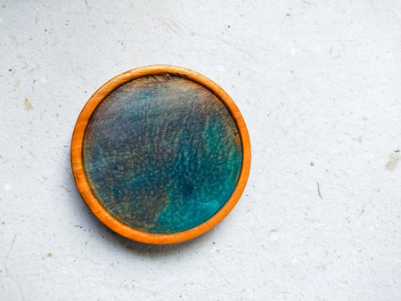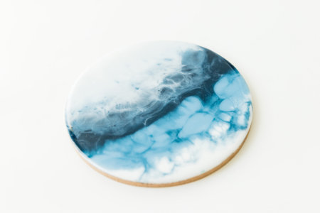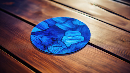 The blue coasters is made of epoxy resin. Stand, tray, or decorative element on wooden shelf.