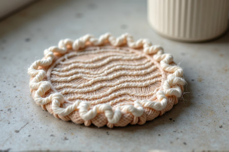 Beige woven coaster with braided edges on concrete surface. That the image is generated using AI.