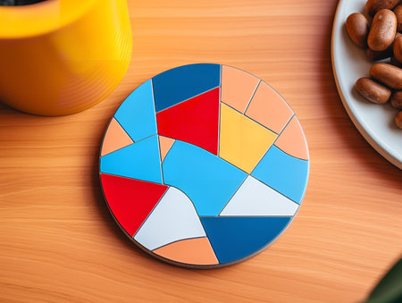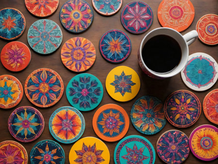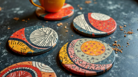 Colorful handcrafted ceramic coasters on dark surface with patterned design. That the image is generated using AI.