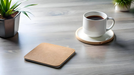 A simple yet elegant image featuring a cup of coffee on a wooden coaster. accompanied by a potted plant and a stylish cork coaster. Perfect for blogs. websites. and social media content focused on home decor. coffee culture. or minimalist aesthetics.