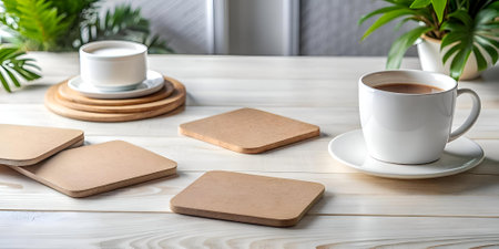 A clean. minimalist composition featuring a cup of coffee and stylish coasters on a white wooden table. Perfect for adding a touch of sophistication to your designs.