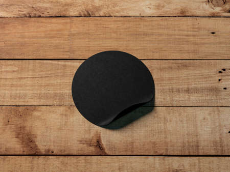 Black round adhesive sticker mockup on wooden table