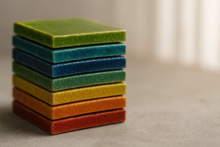 Stacked Colorful Ceramic Coasters With Crackle Glaze In Warm Light