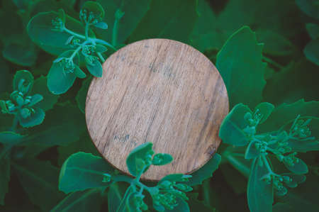 Mock up wooden empty round board on the green leaves. Layout for design