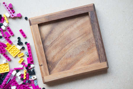 Empty of wood box and pieces of colorful nano block. Concept of play and learn