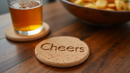 Round cork coaster with Cheers next to cocktail glass and snacks on table