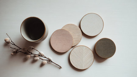 This beautiful arrangement features wooden coasters in neutral tones alongside a cup, showcasing a minimalist and cozy aesthetic.