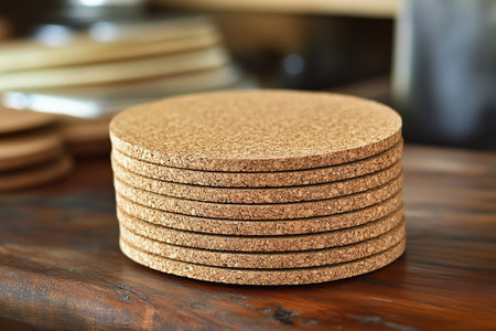Stack of cork coasters on wooden surface, eco friendly craftsmanship and design.