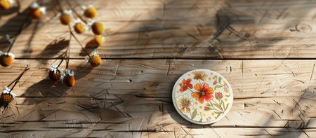 An elegant sticker mockup with a floral design, displayed on a rustic wooden table with soft shadows, conveying a sense of warmth and creativity, perfect for craft brands, --ar 16:7 --v 6 Job ID: 2491f411-0cd3-48ee-b339-38568bcb8bd9