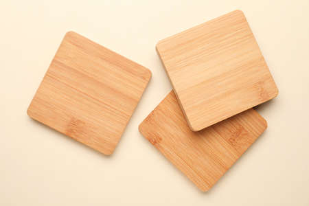 Stylish wooden cup coasters on beige background, flat lay