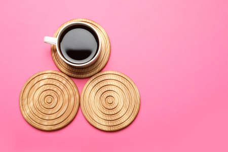 Cup of coffee and stylish wooden coasters on pink background, flat lay. Space for text