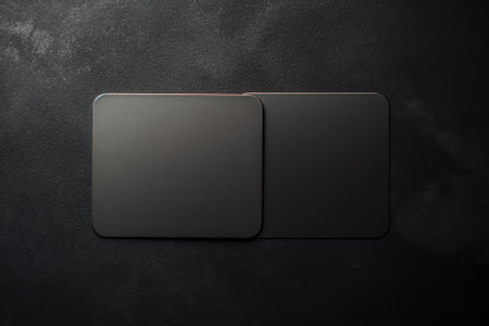 Two blank square beer coasters on black plaster background.