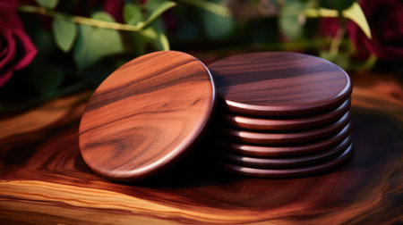 Set of wooden coasters arranged on a wooden table, with warm natural lighting accentuating the earthy tones and texture.