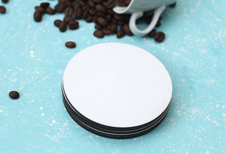 Coasters with coffee beans, white round mockups on blue concrete background
