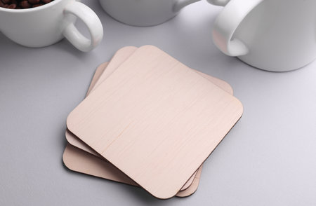 Wooden square drink coasters and cups on gray background
