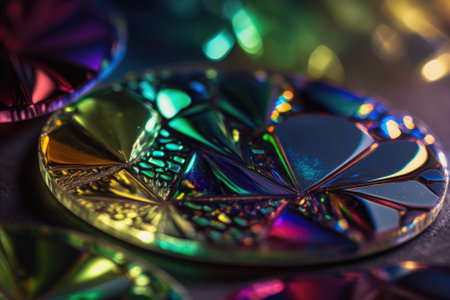 Beautiful lead crystal glass patterns in macro, lit by natural light, are reflected in vibrant, multicolored bokeh. Generative AI