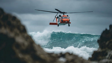 Coast guard helicopter conducting an important search and rescue mission, flying low over crashing waves and a stormy sea along a rugged coastline, symbolizing emergency response and preparedness