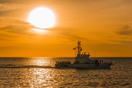 Coast guard ship patrolling the coastline at sunset, ensuring maritime security and safety while navigating the calm ocean waters
