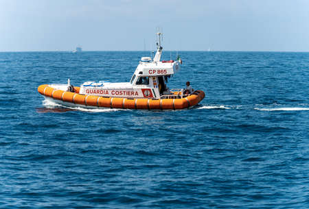 GULF OF LA SPEZIA, LIGURIA, ITALY - JULY 21th, 2019: an Italian coast guard patrol (Guardia Costiera) in the Mediterranean Sea, Gulf of La Spezia, Liguria, Italy, Europe