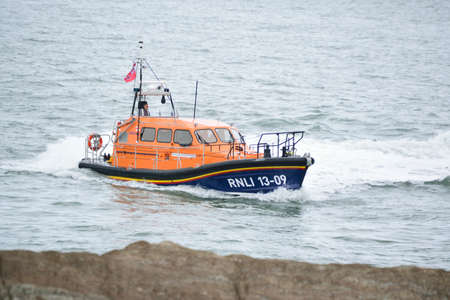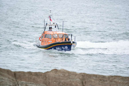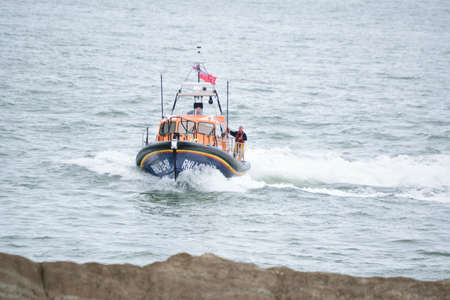 Carvoeiro , Portugal - October 20, 2017: Rescue boat patrols near Carvoeiro on the southern Atlantic coast of Portugal.