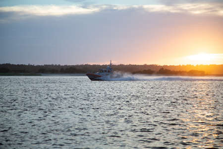 Moscow, Russia - June 21, 2018: Police boat rushing along water surface on a sunny summer day