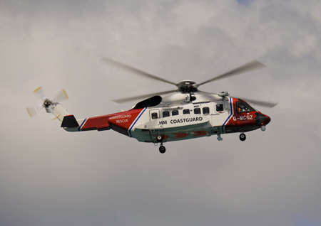 21 June 2018, Cornwall, UK. Red and white HM Coastguard, Sikorsky air, sea, rescue helicopter patrolling the beach during overcast weather.