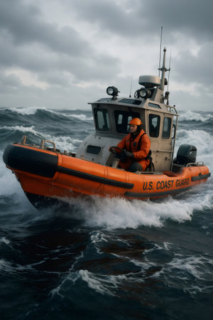 US Coast Guard crew member operating a rescue boat on choppy ocean waters under a cloudy sky, ensuring maritime safety