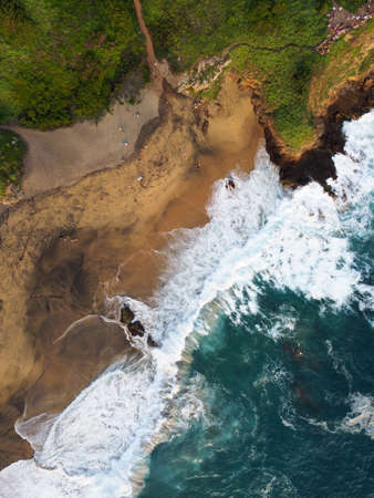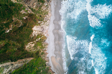 Top view of the coastline with cliff, turquoise water, rocks, foam, waves and trees.