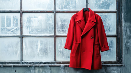 A striking red coat hangs gracefully against a frosted window, embodying elegance and warmth for the winter season. Perfect for fashion enthusiasts.
