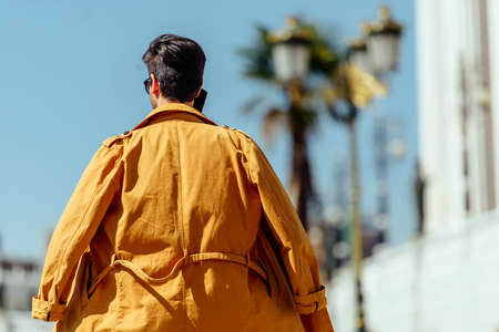 Cheerful guy wearing yellow coat taking promenade in the city center