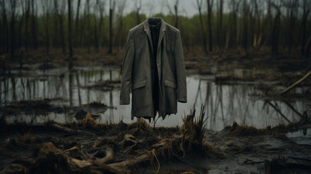 a spooky coat, representing deconstructed tailoring, stands in the lake surrounded by the rainforest. this eerie image captures the essence of new american documentary photography with its photorealistic composition. the rusty debris adds to the haunting atmosphere, while the shot on 70mm film and incorporation of found footage give it a frayed and mysterious quality. ai generated