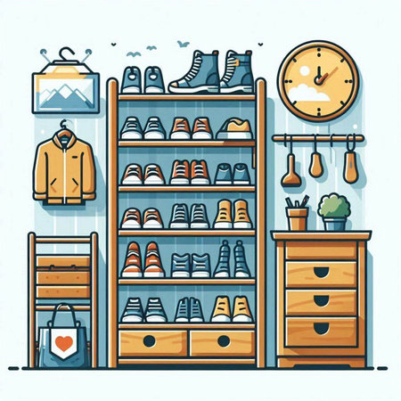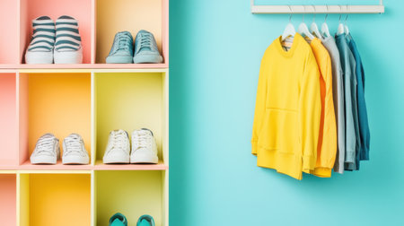 A vibrant and cheerful display of casual clothing and stylish footwear in a modern interior setting. The creative arrangement highlights a fresh and organized wardrobe.