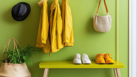 A vibrant entryway featuring bright yellow jackets hanging against a green wall, stylish shoes on a wooden bench, and a touch of greenery. Perfect for a cheerful and organized home setting.