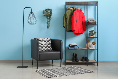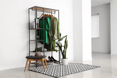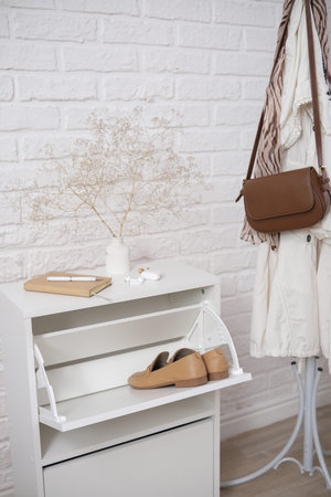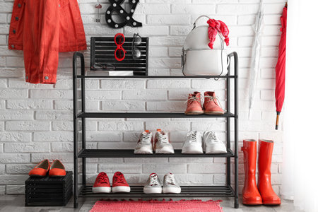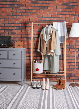 Stylish hallway interior with shoe rack and hanging clothes on brick wall