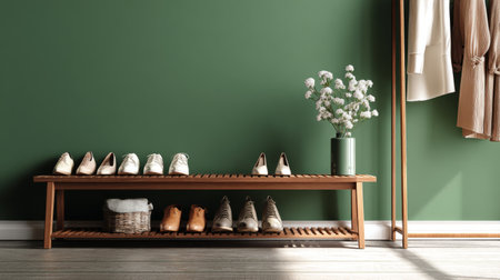Contemporary hallway corner with wooden shoe rack, women shoes neatly arranged, muted green wall creating calm background