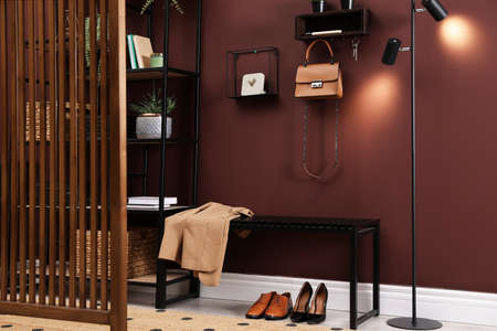 Stylish hallway with coat rack and shoe storage bench near brick wall. interior design