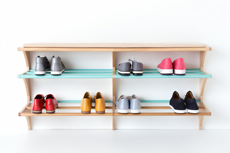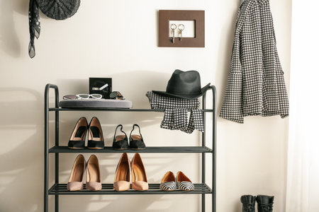 Modern hallway with shoe stand neatly displaying women shoes against a stylish green wall, bright natural light highlighting the setup