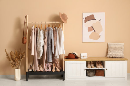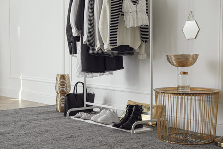 Rack with clothes, shoes, sideboard and pampas grass in interior of dressing room