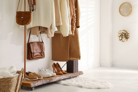 Rack with stylish female clothes, shoes and houseplant in interior of light room