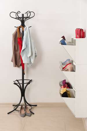 Wooden coat rack, bench and wicker basket in a bright hallway with coat, purse and shoes, creating a cozy and organized space