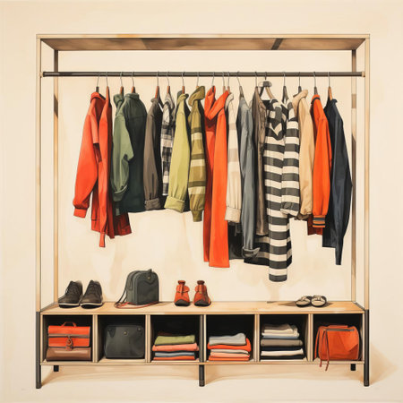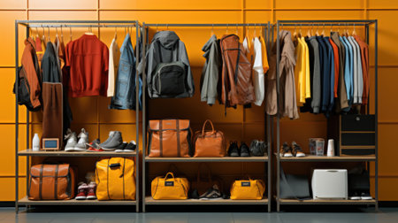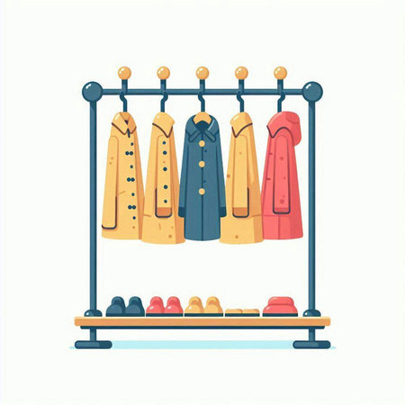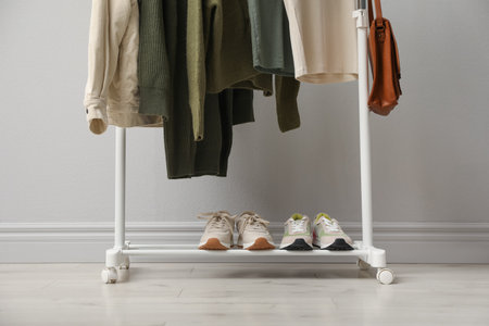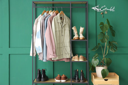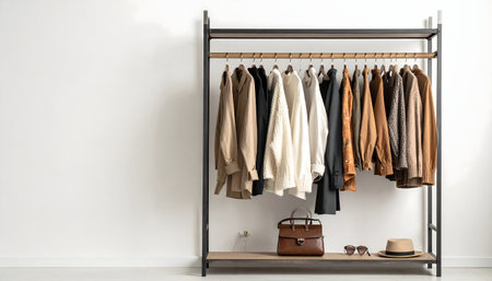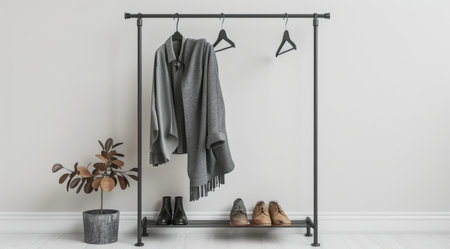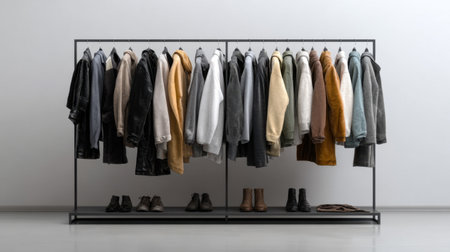 A modern clothing rack showcases a variety of stylish outerwear, including jackets and sweaters, complemented by footwear. Perfect for fashion and lifestyle concepts.