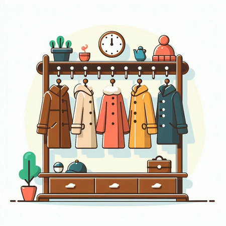 Vector illustration of a coat hanging on a hanger in a wardrobe