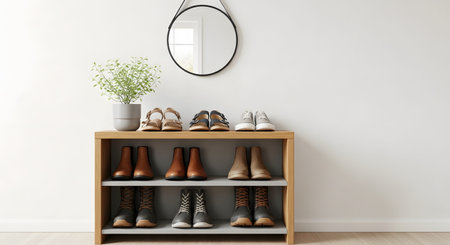 A clean and organized entryway featuring a wooden shoe rack filled with boots and shoes, a round mirror on the white wall, and a potted plant. The interior design emphasizes minimalism, tidiness, and modern home decor.