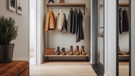A modern entryway featuring a sleek coat rack, stylish bags, and natural plants. This minimalistic setup invites warmth and organization into any fresh interior space.