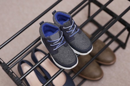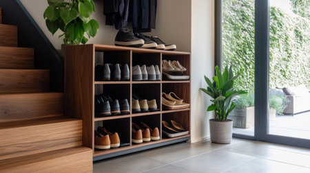 A contemporary shoe rack with open shelving, featuring a well-organized collection of shoes and stylish storage boxes for accessories, in a stylish foyer